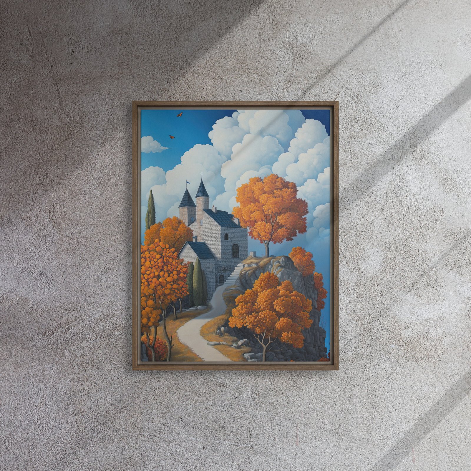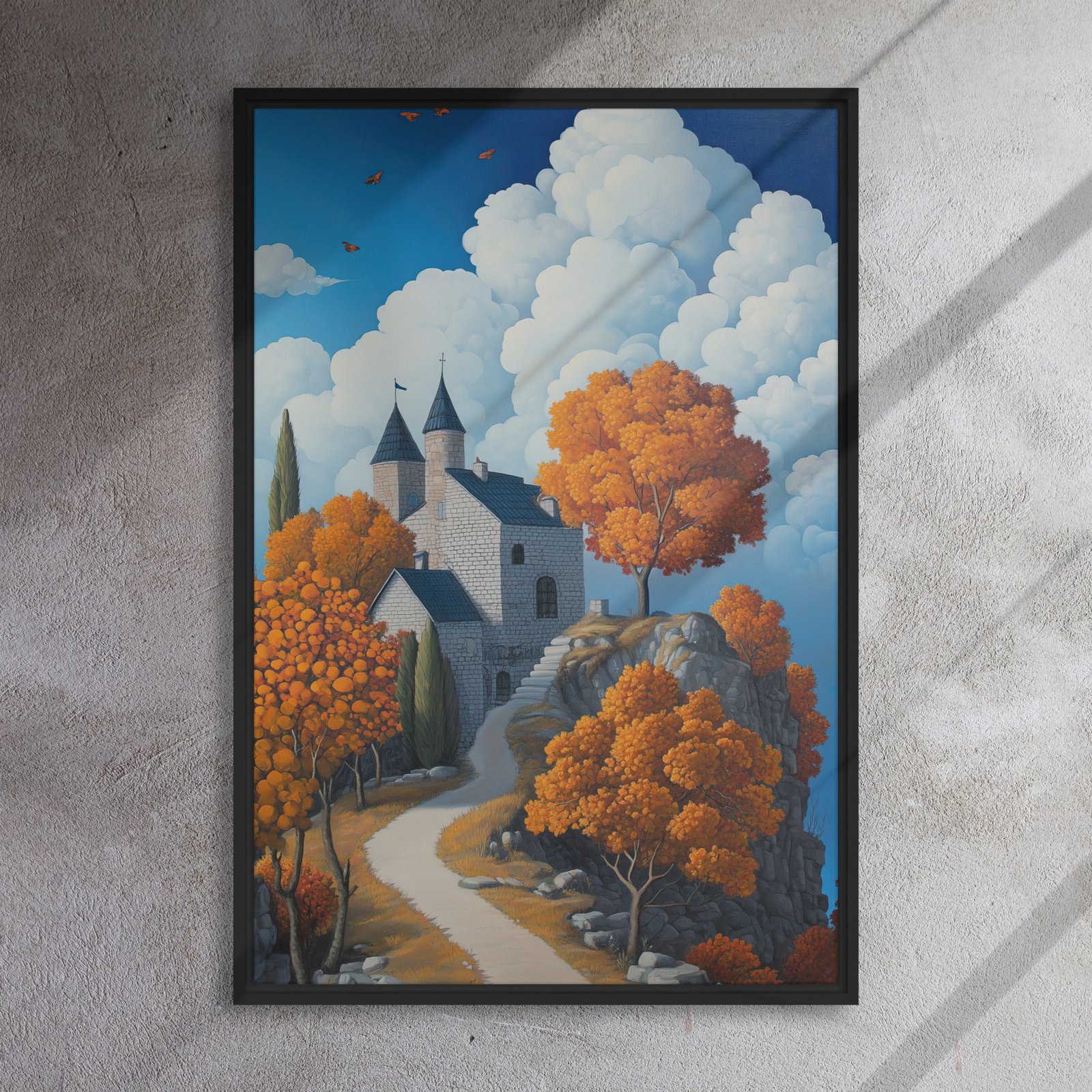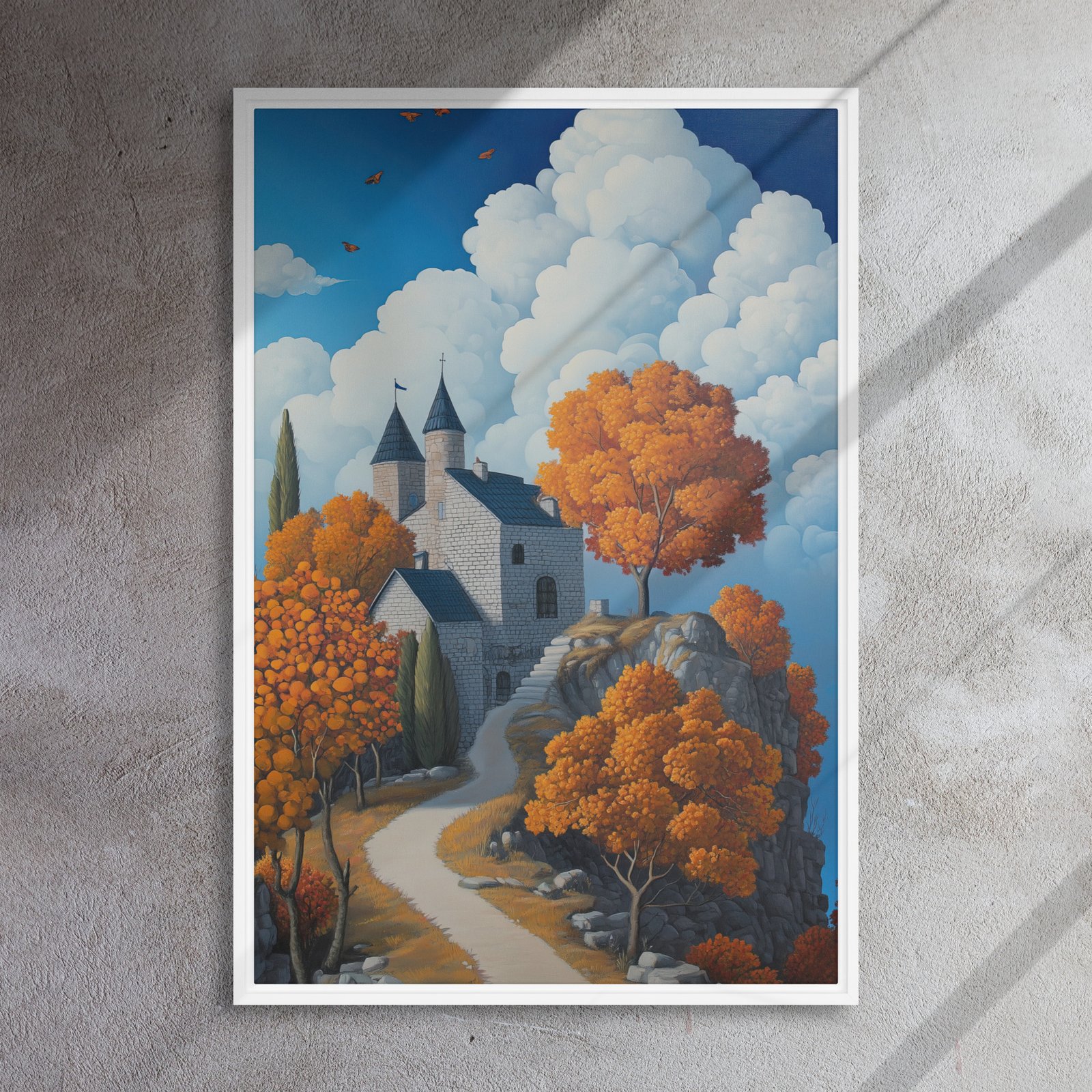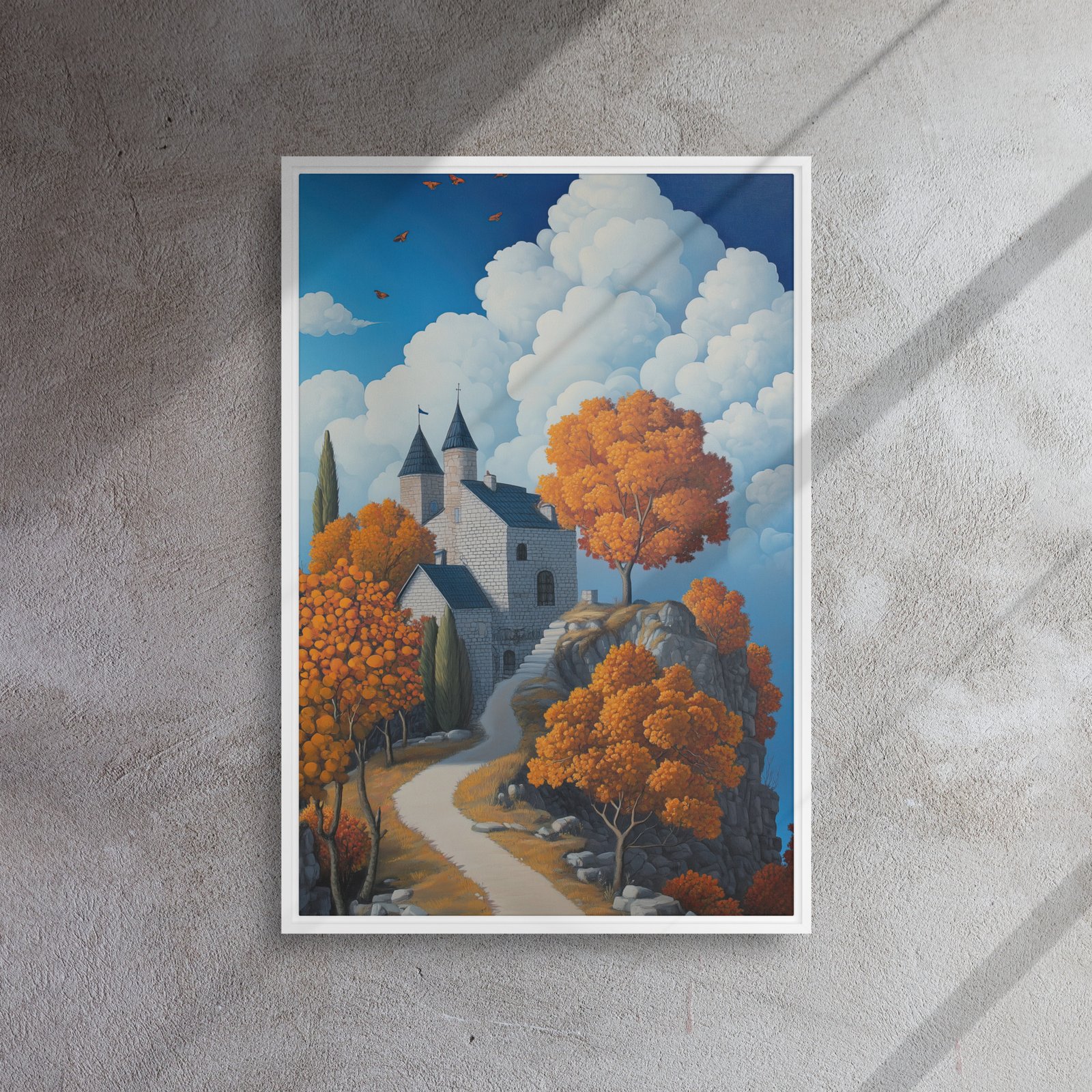 Elevate your environment with “Castle Autumn Cloudscape Art”!