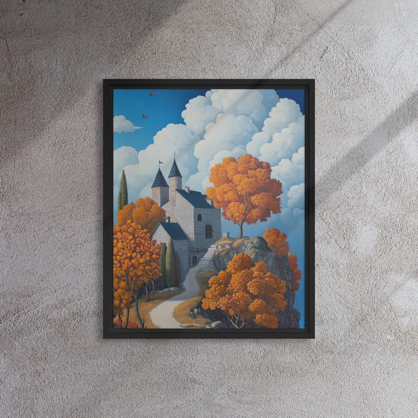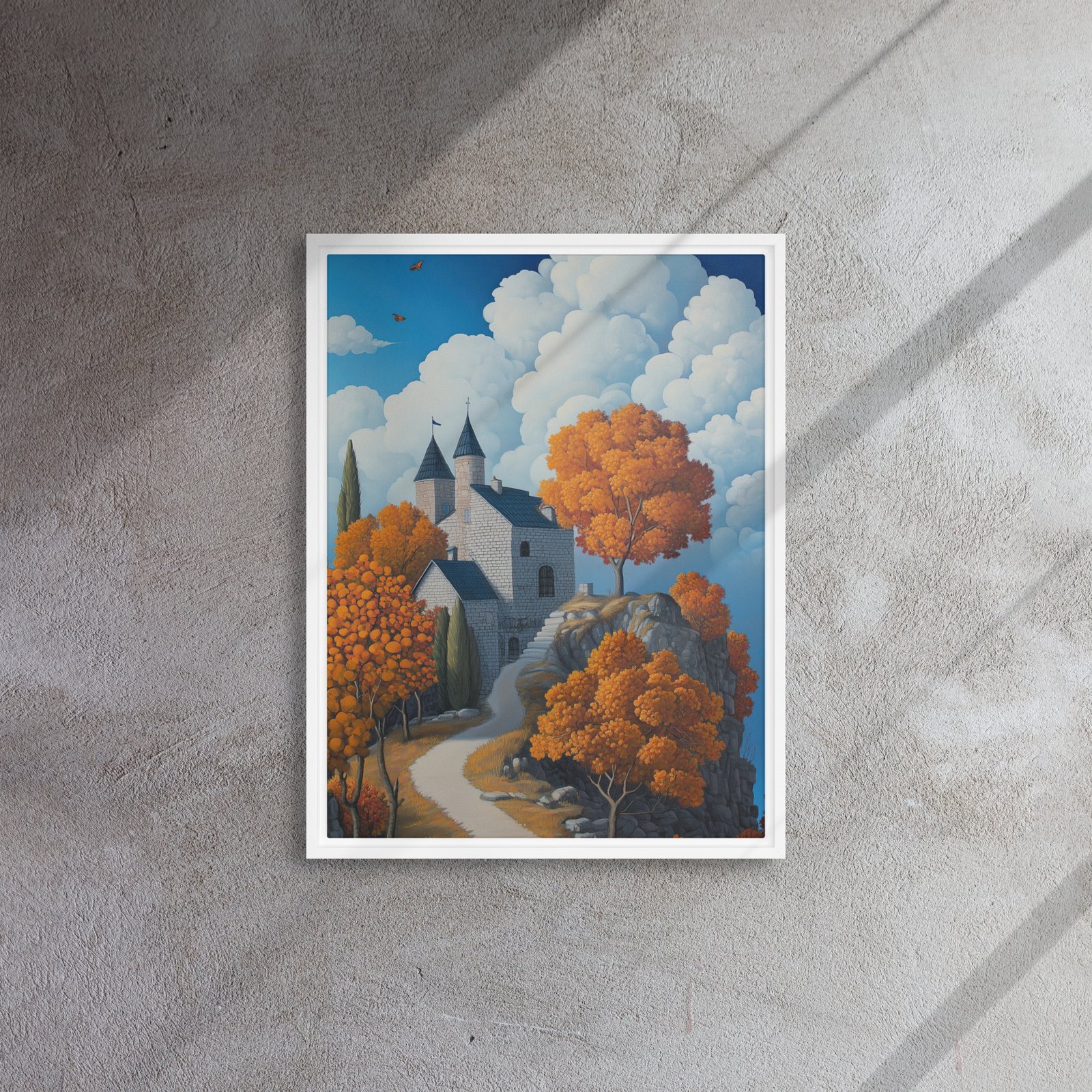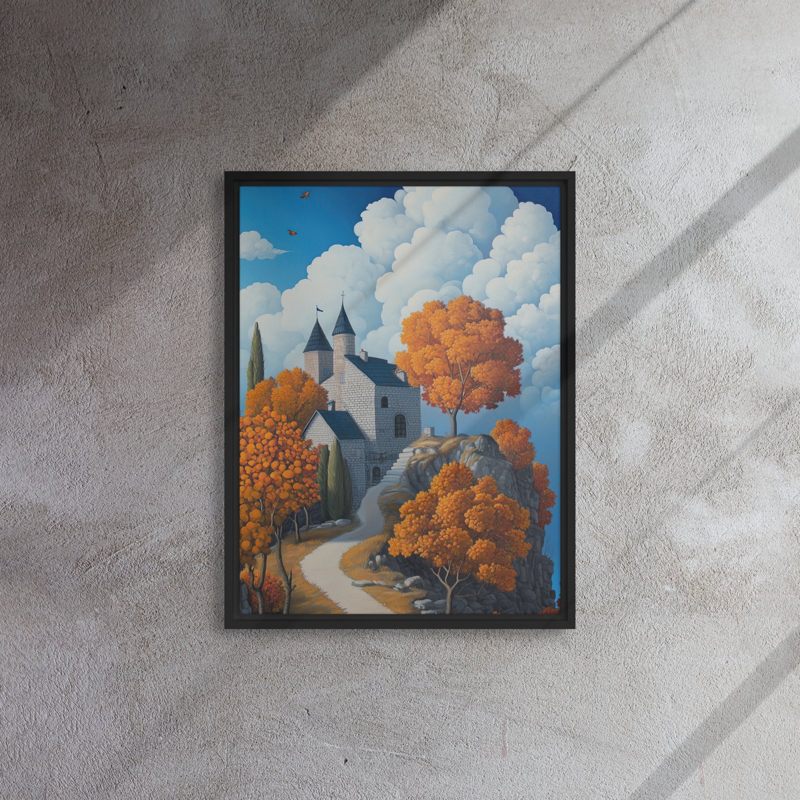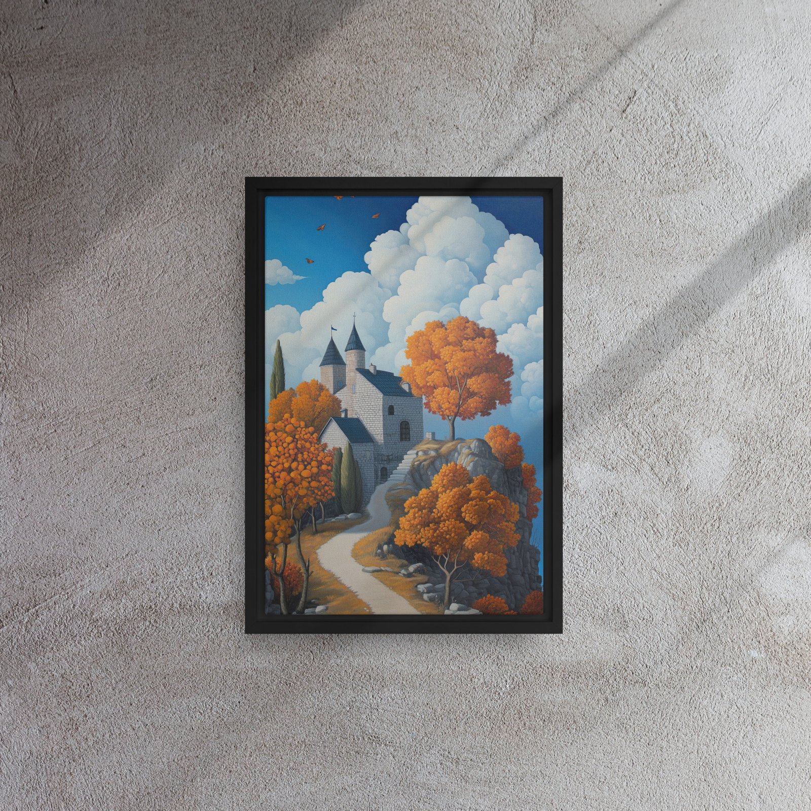 Elevate your environment with “Castle Autumn Cloudscape Art”!