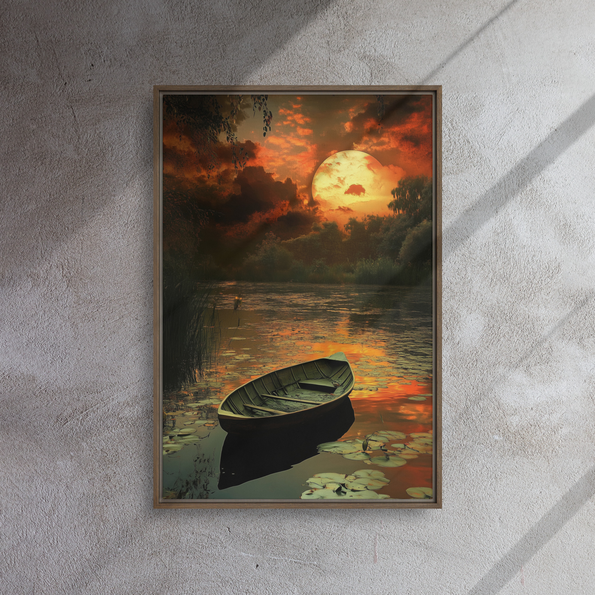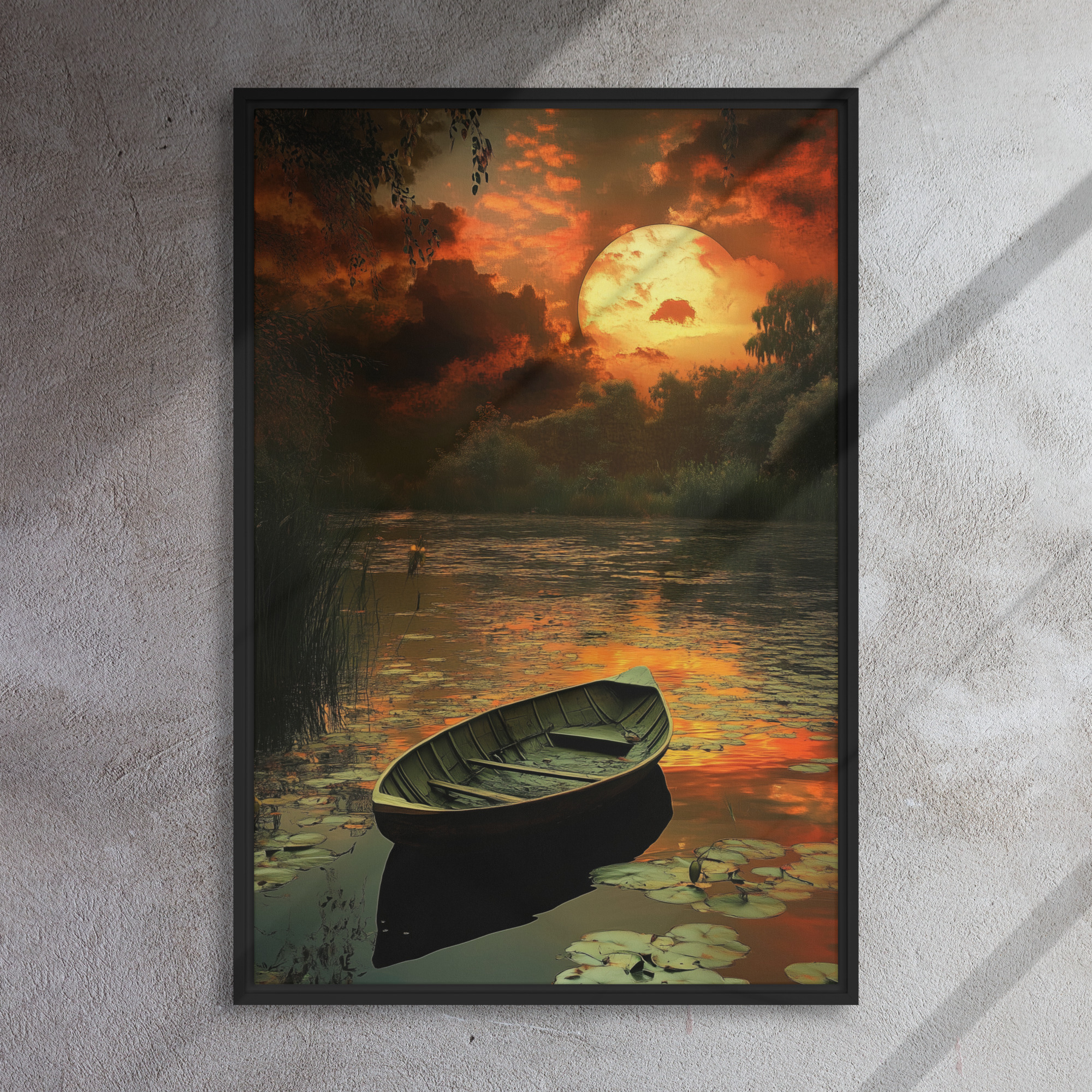 Elevate your environment with “Sunset Rowboat Art”!